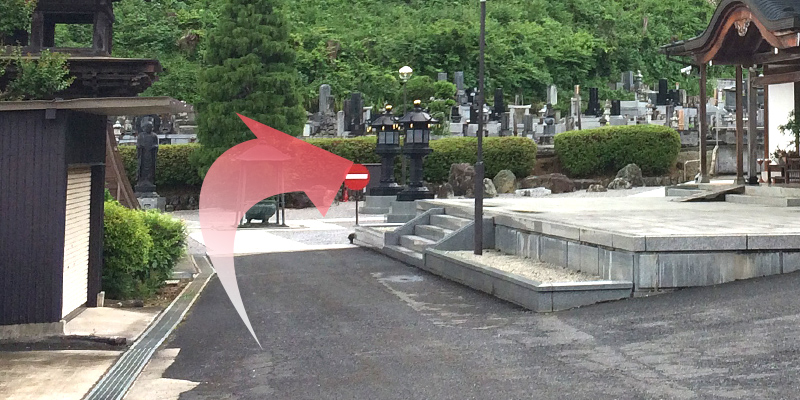 左手の鐘楼と右手に庫裏の間をお進みください。
