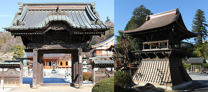 保福寺の山門と鐘楼は、慶応元年(1865)に信州の工匠により再建されました。江戸末期の豪壮華麗な様式を示す寺院建築物で、組物や妻飾及び装飾的彫刻は意匠的・技術的に優れています。また、旧甲州街道の上野原宿や市場の経済的発展を象徴的に示す建物として、学術的・歴史的に貴重です。山門は唐門様式の四脚門(しきゃくもん)で、随所に施された彫刻や、組物・妻飾に江戸建築の豪華さがよく表現されています。鐘楼は市内では珍しい袴腰(はかまごし)形です。組物などの豪華な造りや、軒反(のきぞり)が強い伸びやかで整った姿が特徴です。